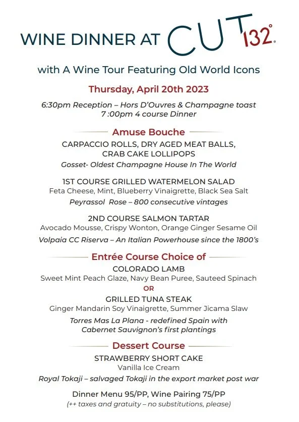 Join us for CUT132's Inaugural Wine Dinner Series. Every month we partner with a different wine maker to offer you an amazing selection of wines expertly paired with dishes crafted by our Executive Chef.